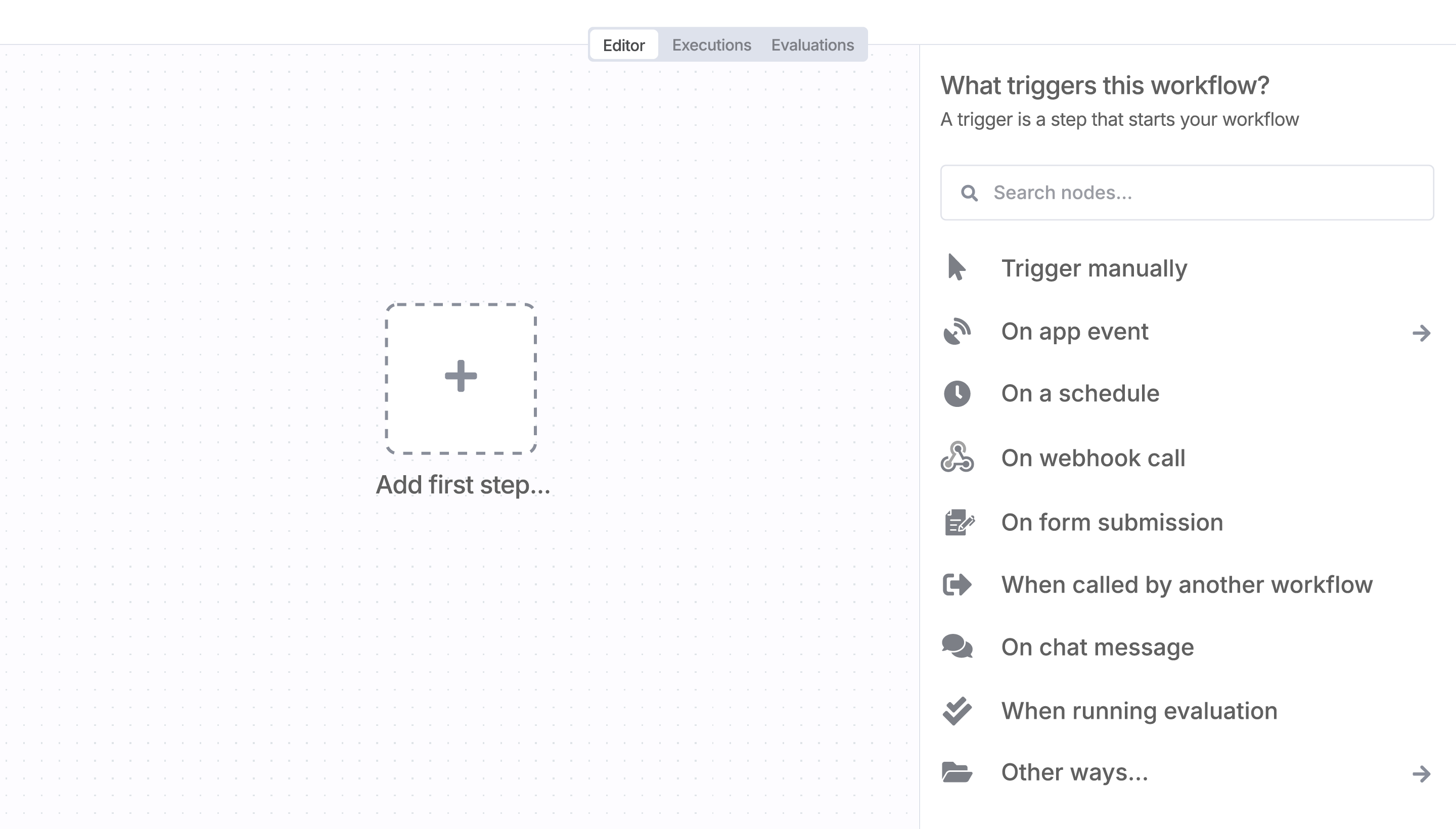 Sign in to n8n, open the editor, and click + in the top right to open the Nodes panel